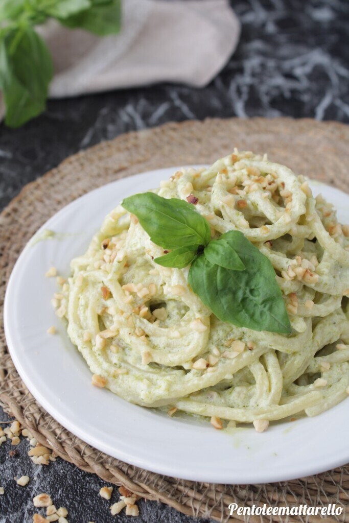 Les spaghetti au pesto, ricotta et noisettes font partie de ces plats qui nécessitent peu d’ingrédients et peu de temps de préparation mais qui donnent un résultat absolument exceptionnel en termes de goût et de saveur. Les pâtes au pesto sont souvent préparées dans chaque foyer, elles nécessitent vraiment peu de temps de préparation et donc même pour ceux qui travaillent, c’est un plat « prêt à l’emploi ». J’ai ajouté une ricotta paysanne, mais même celle que l’on trouve dans chaque supermarché convient parfaitement, une belle pincée de noisettes concassées et une belle râpée de parmesan; puis, pour terminer, une louche d’eau de cuisson pour lier le tout. Je vous assure que c’est un plat à se lécher les babines littéralement.