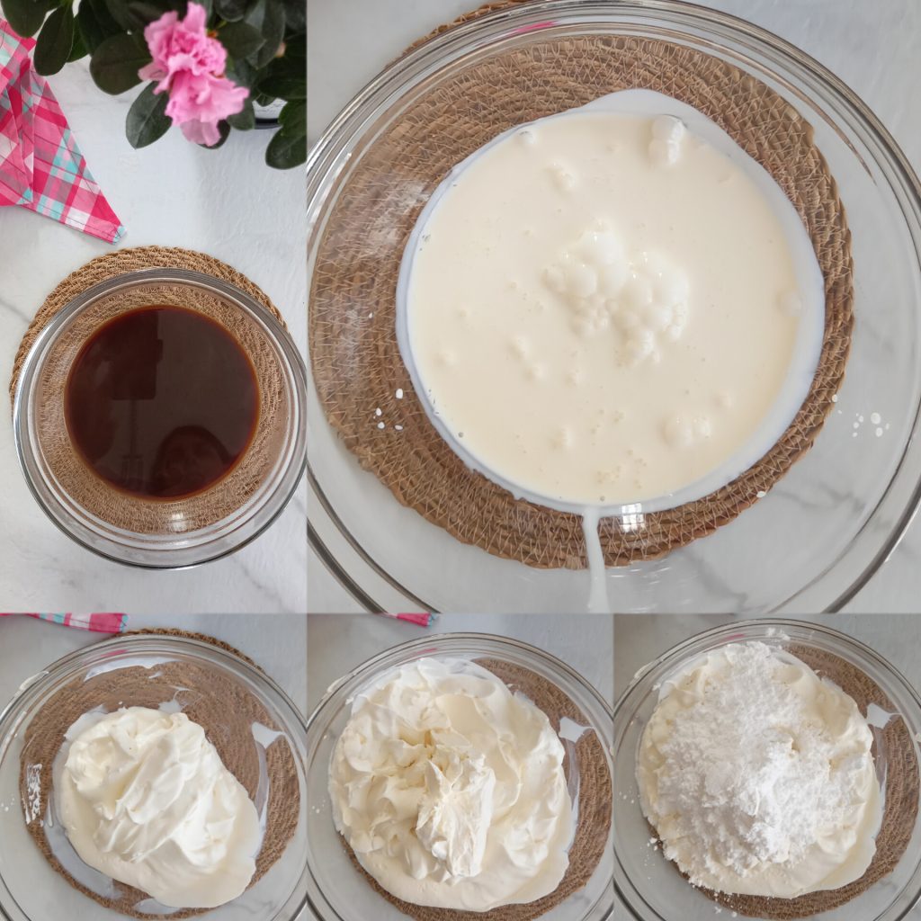 Tout d’abord, préparez le café et laissez-le refroidir. Dans un bol, fouettez la crème ferme avec un batteur électrique, ajoutez le sucre glace et le mascarpone. Avec une spatule, travaillez le mélange de bas en haut sans le faire retomber.
