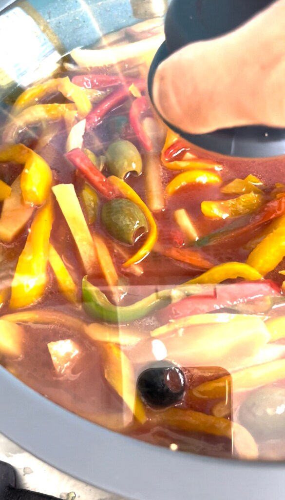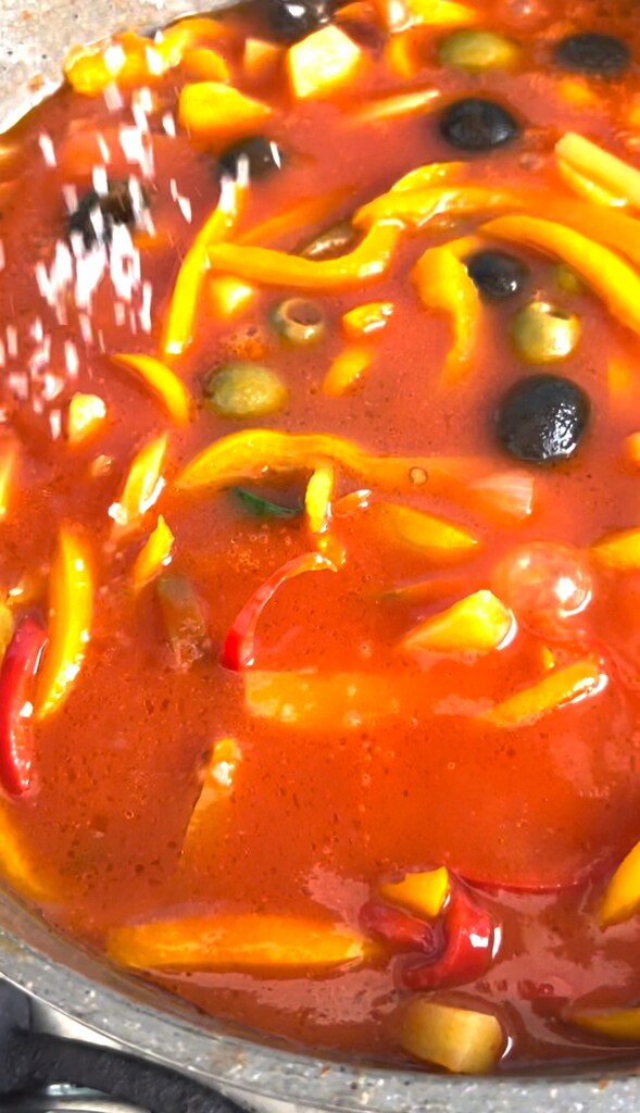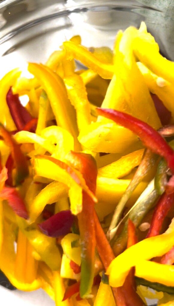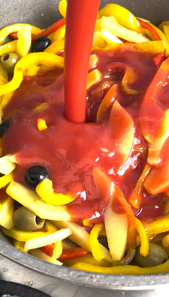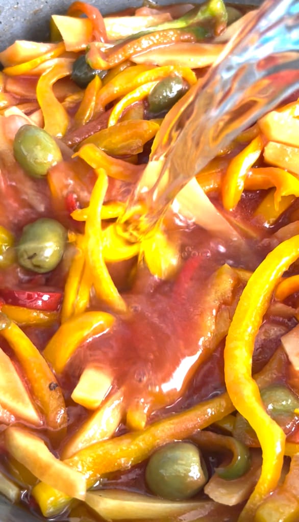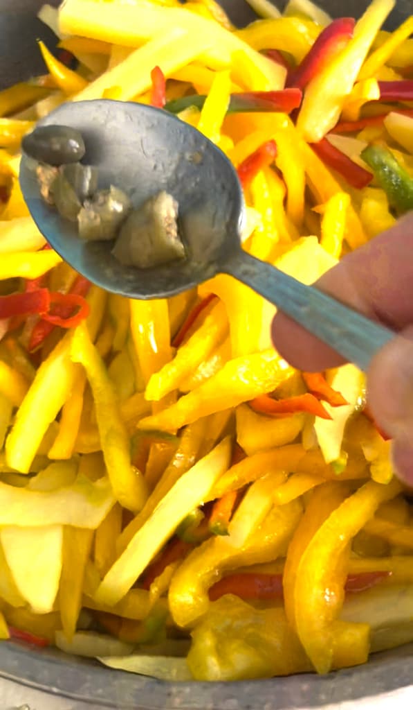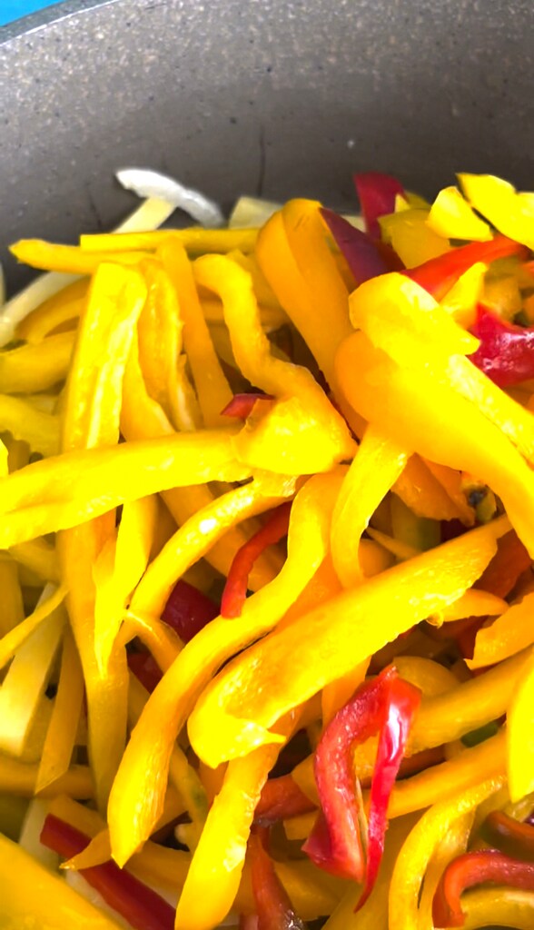 • À ce stade, ajouter les poivrons, remuer et cuire encore 5 mn.