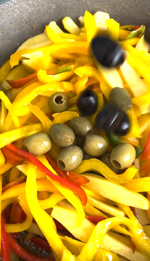 Accompagnement de pommes de terre, olives et poivrons à la poêle