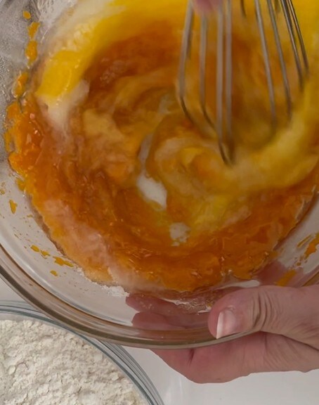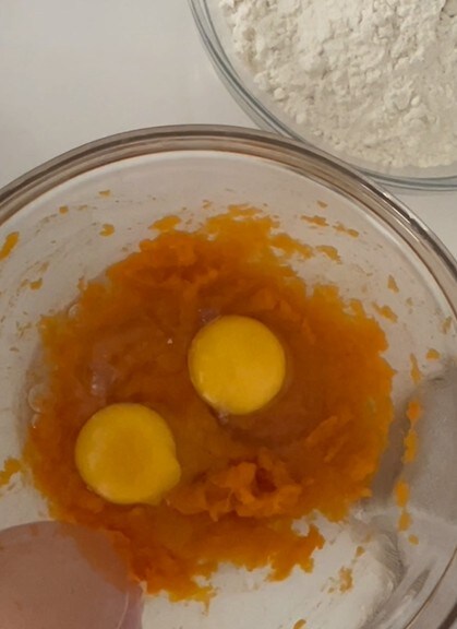 Verser la purée de citrouille dans un bol et ajouter les œufs.