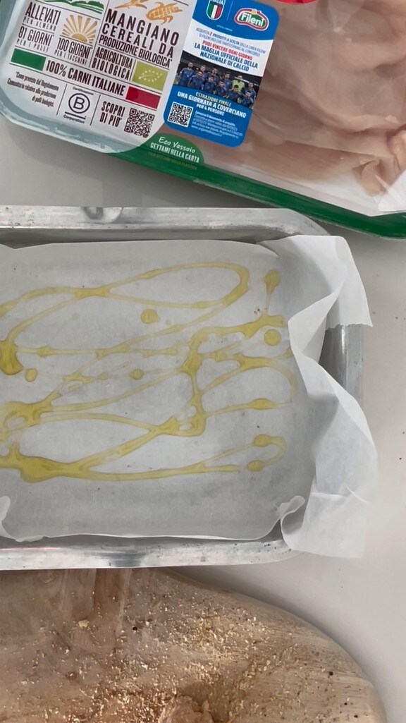Recouvrir la plaque de papier sulfurisé et arroser d’un filet d’huile d’olive extra vierge