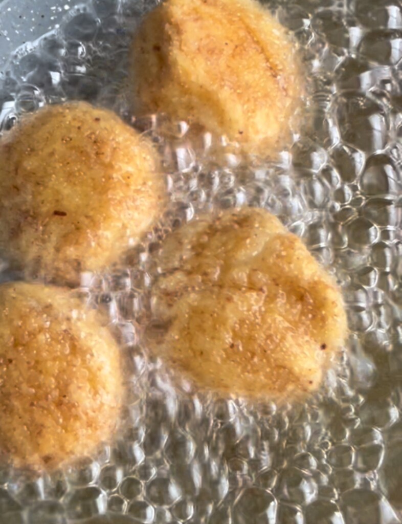 Frire dans une abondante huile de graines d’arachide et déguster nos bouchées de cabillaud à la crème frites.