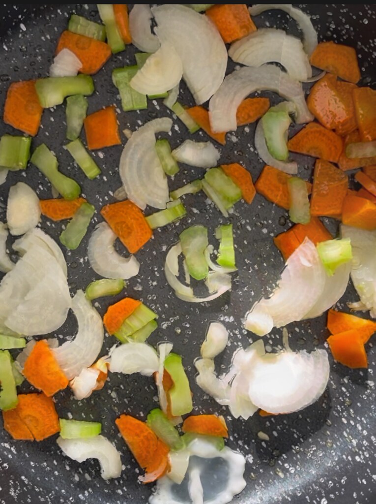 Dans une autre poêle, faire un soffritto avec huile, carotte, céleri et oignon découpés en morceaux.