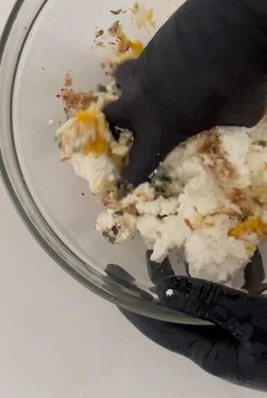 Dans un bol, ajouter le pain rassis finement émietté, les œufs, le sel, le poivre, le Grana, le pecorino, la ricotta et le persil haché.