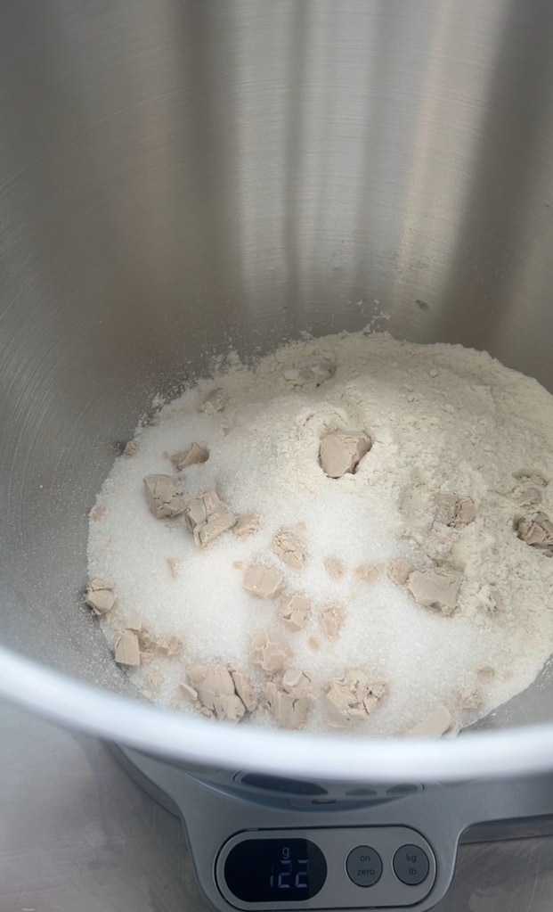 Dans le robot pâtissier, insérer la farine manitoba