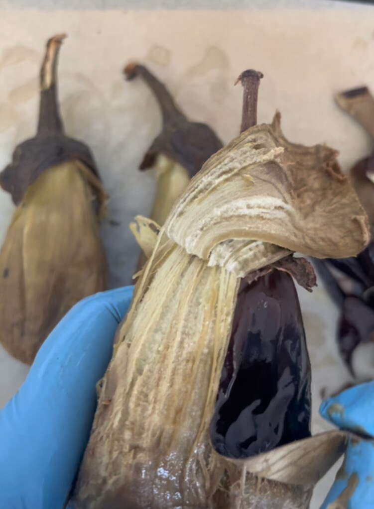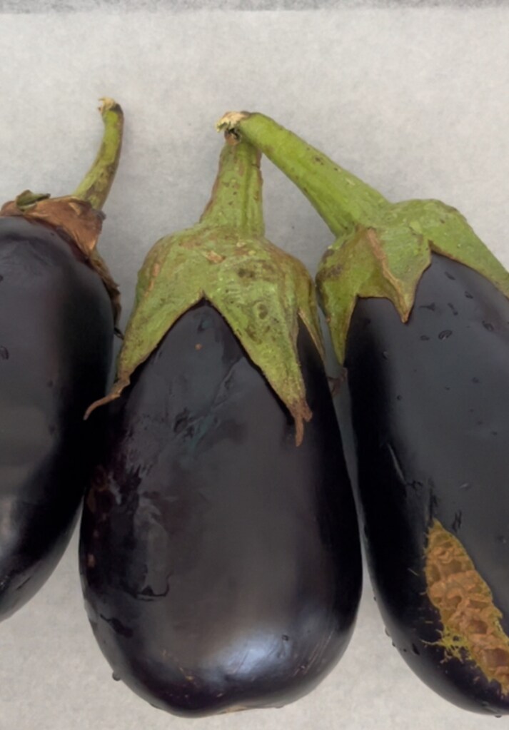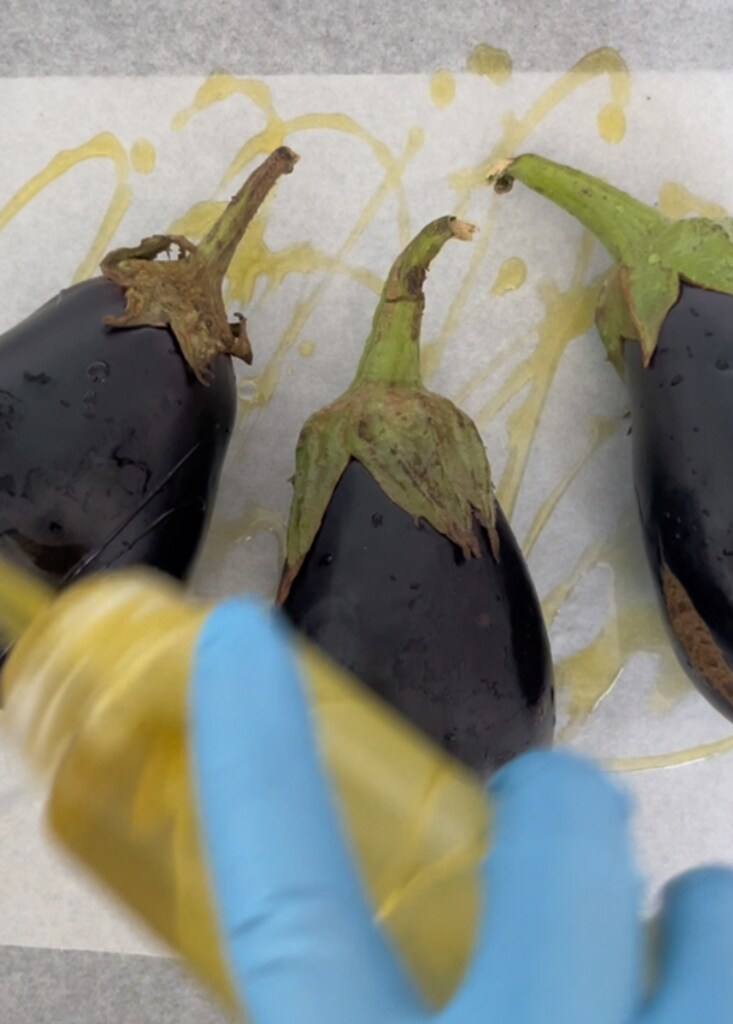Dans un plat recouvert de papier sulfurisé, placer les aubergines