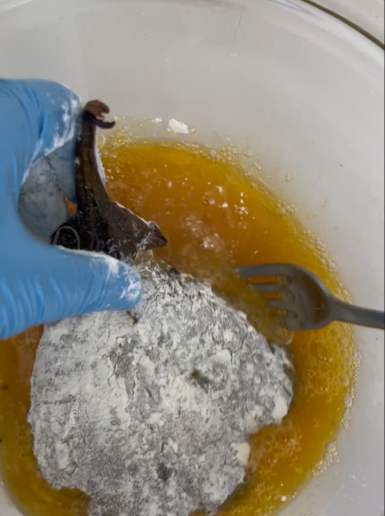 Passer l’aubergine d’abord dans la farine des deux côtés.