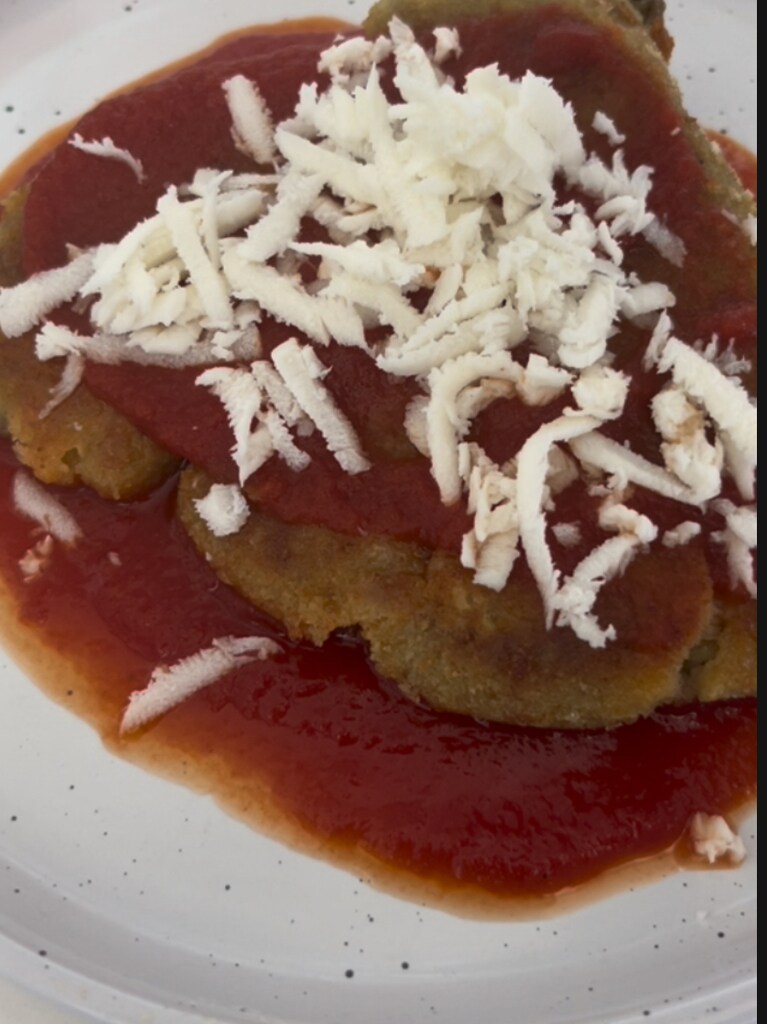 À ce stade, couvrir avec plus de sauce et beaucoup de cacioricotta râpé avec une râpe grossière par-dessus. Notre côtelette d’aubergine à la Norma est prête à être dégustée.