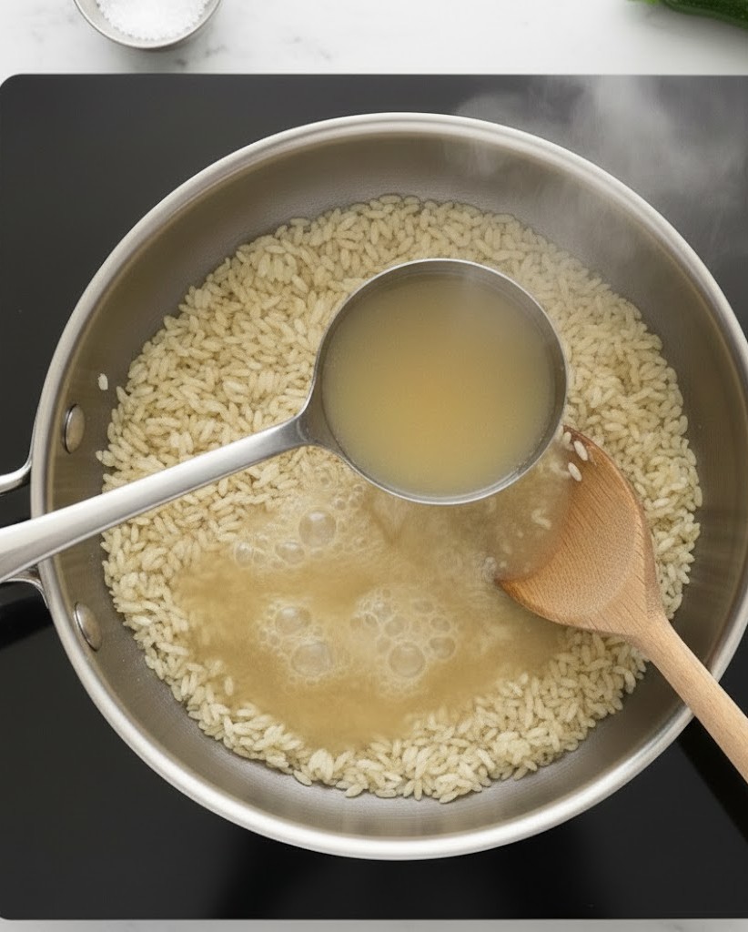 Presque à la fin de la cuisson du risotto, ajouter du bouillon avec de la poudre de safran dissoute.