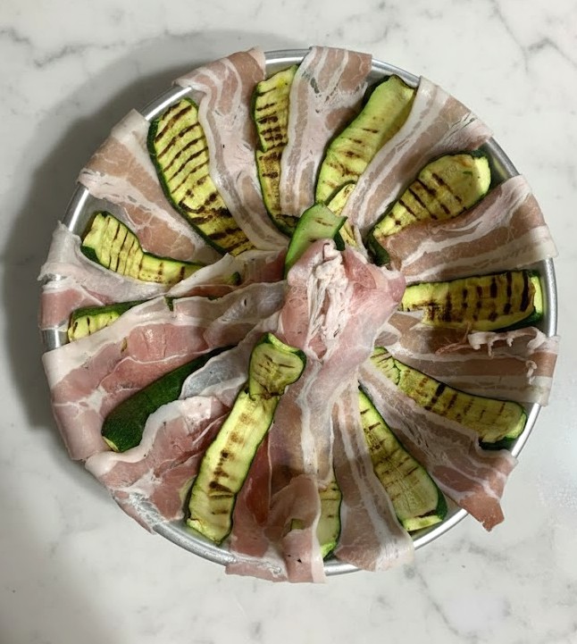 Tapissez les parois du moule en alternant et en superposant à moitié de leur largeur, une tranche de courgette grillée et une tranche de lard, en veillant à laisser la partie la plus rouge du lard vers l’extérieur pour obtenir un effet décoratif une fois la couronne démoulée. Continuez ainsi jusqu’à épuisement des ingrédients et à couvrir tout le diamètre du moule.