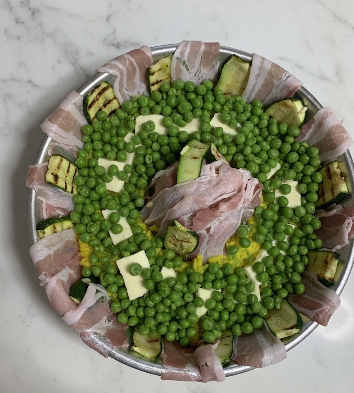 et terminer avec le speck et les courgettes. Cuire au four statique préchauffé à 180° pour environ 40-50 minutes (si four ventilé 160° pour 30-40 minutes). Laisser tiédir la couronne puis la mettre sur un plat de service et servir