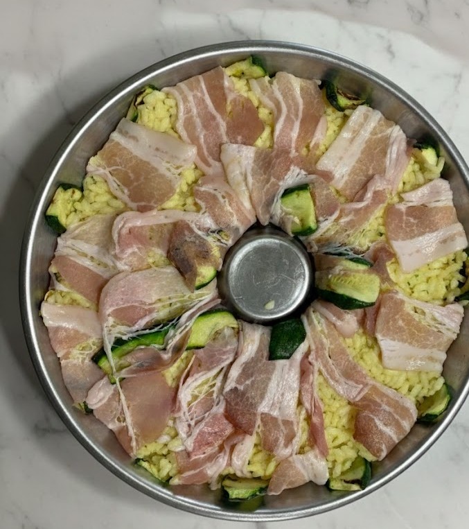 L’Effet « Wow »: Une fois démoulée, la couronne révèle un jeu de couleurs vibrant (le vert des courgettes, le rose du lard et l’or du riz) qui la rend la protagoniste absolue de la table.