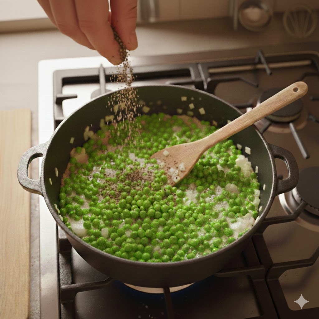 Commencer par la préparation des petits pois. Dans une casserole, faire revenir l’oignon avec de l’huile d’olive et ajouter les petits pois