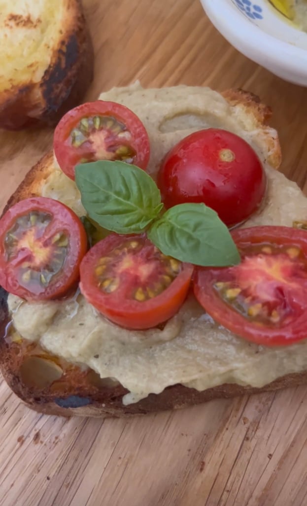 Notre bruschetta avec crème d’aubergine et tomates cerises est prête à être dégustée.