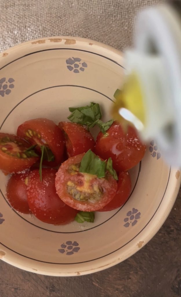 À part, couper les tomates et les assaisonner avec du basilic, du sel et de l’huile d’olive extra vierge