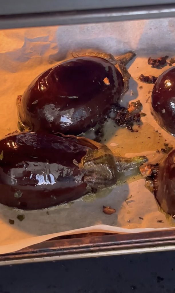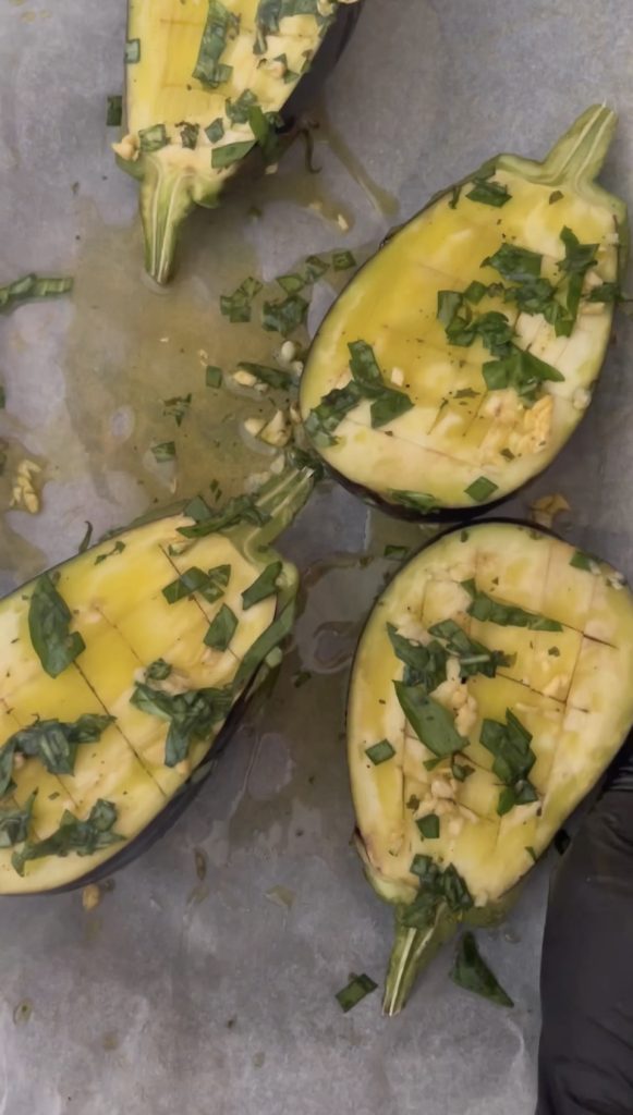 Placer les aubergines avec les entailles vers le haut et les assaisonner avec l’huile aromatisée. Cuire au four préchauffé à 180° pendant 35 minutes
