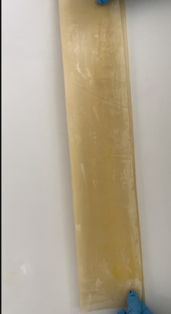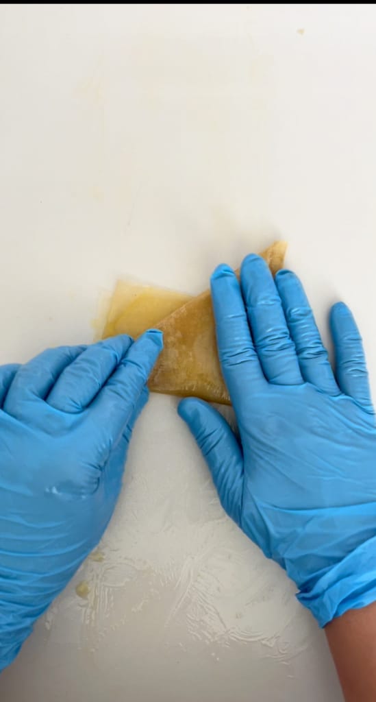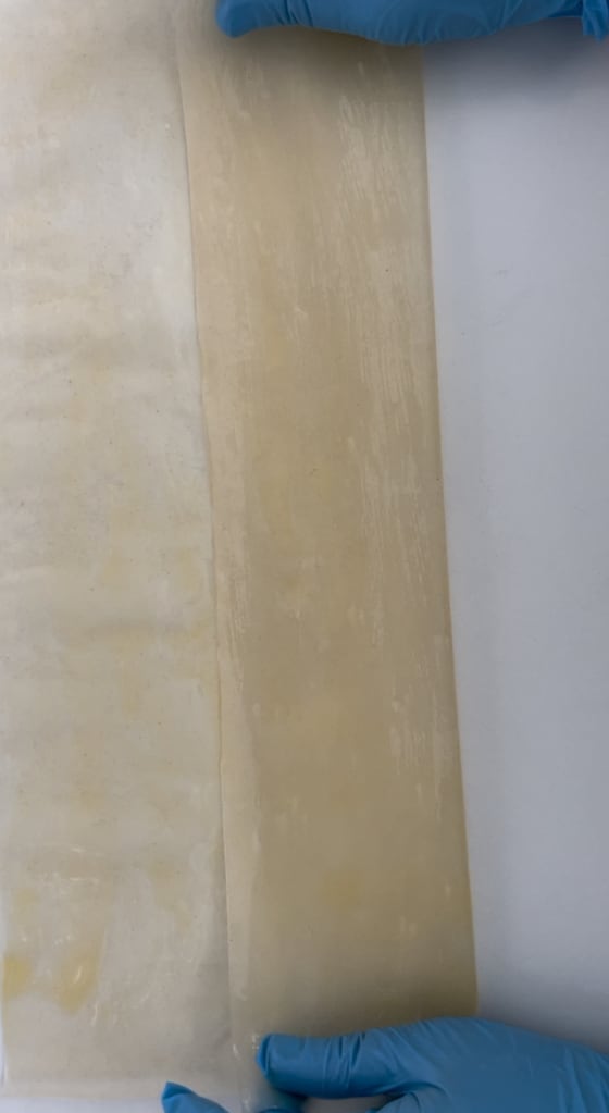 La première chose à faire est de placer sur le plan de travail une feuille de pâte filo et de badigeonner avec le beurre fondu sur toute la surface.