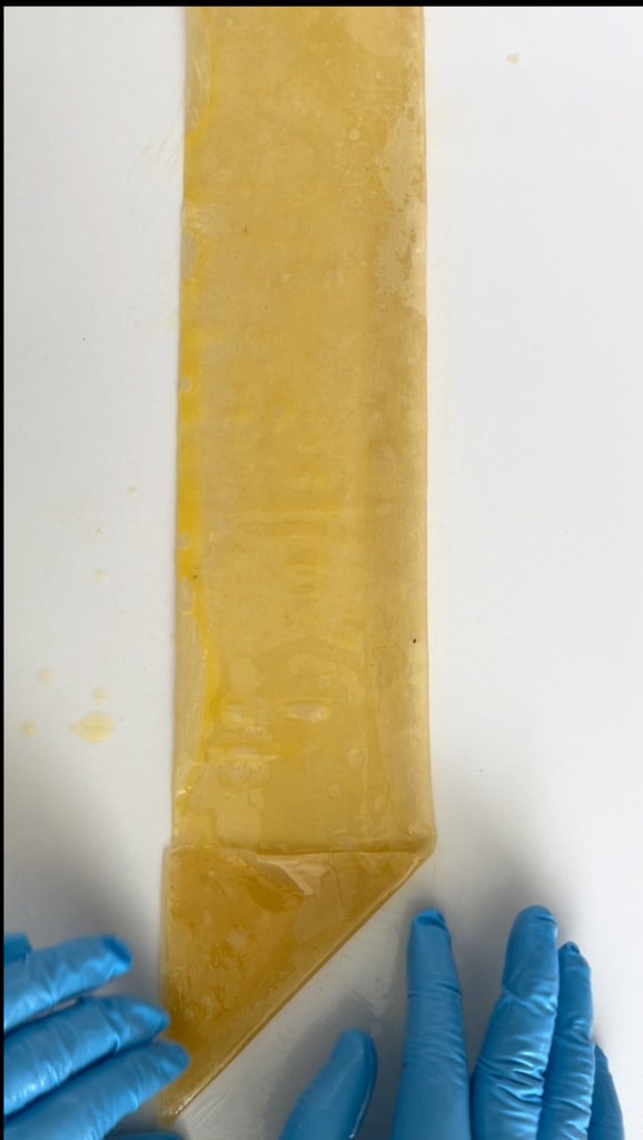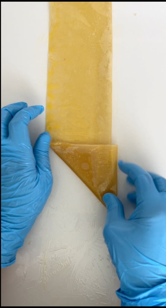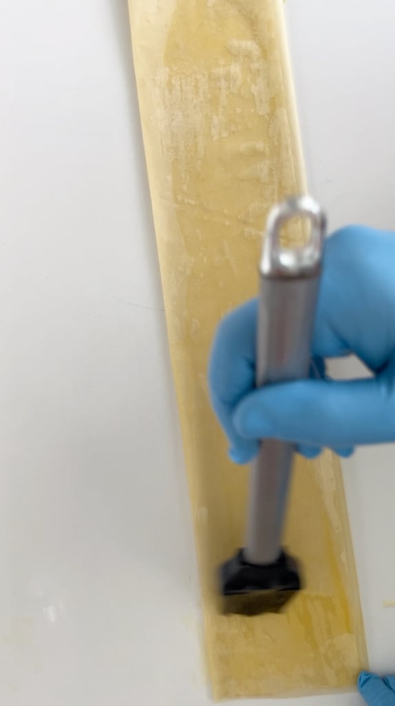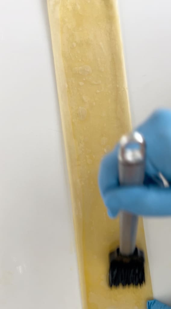 Tourner la bande et badigeonner à nouveau avec du beurre fondu.