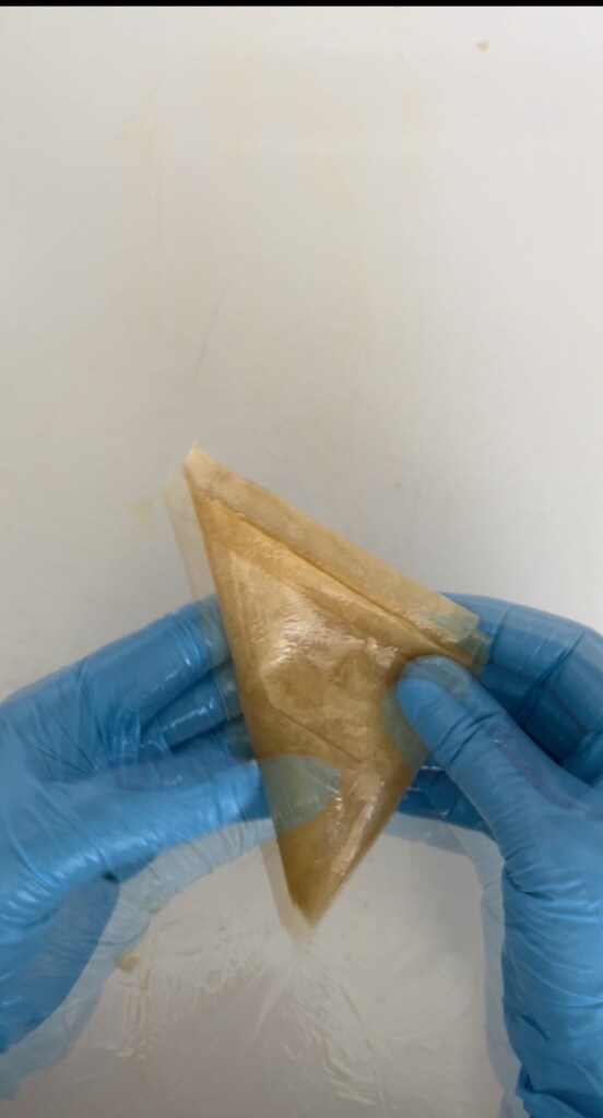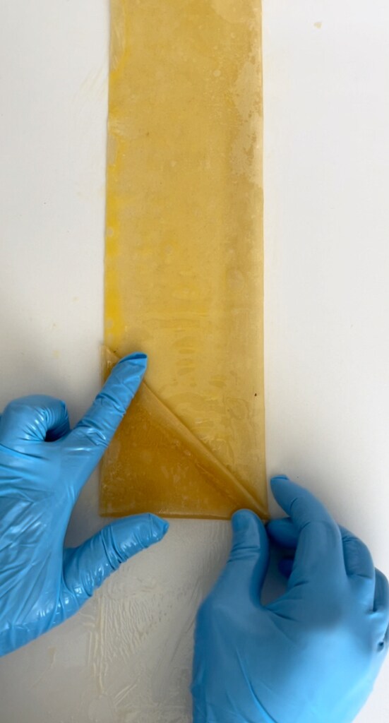 Commencer à composer nos triangles. Prendre le coin inférieur droit de la bande de filo et le plier pour rencontrer le côté gauche en formant un triangle.