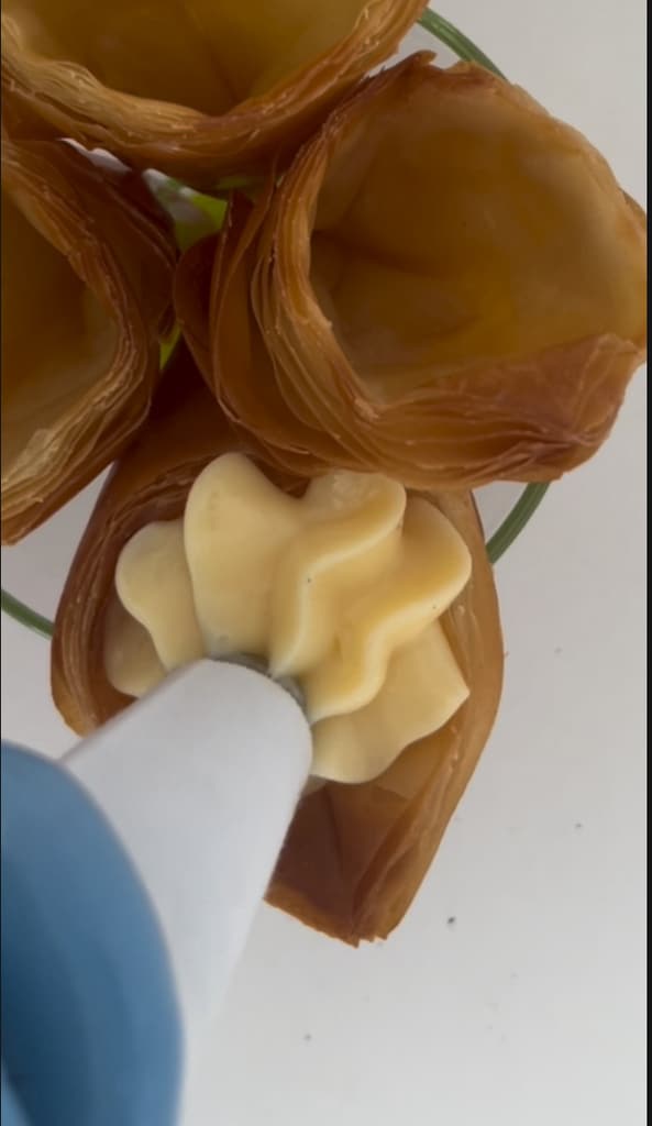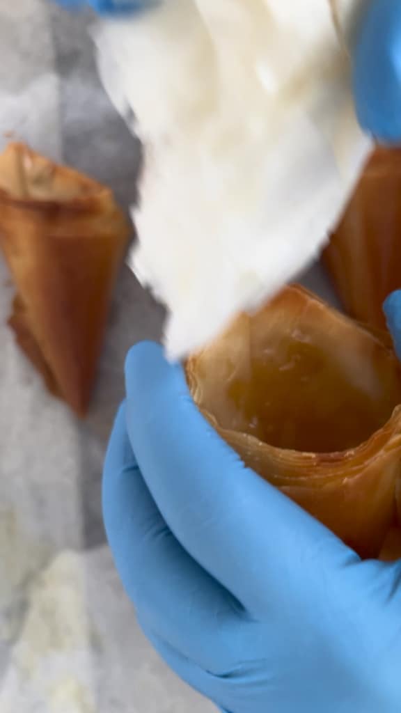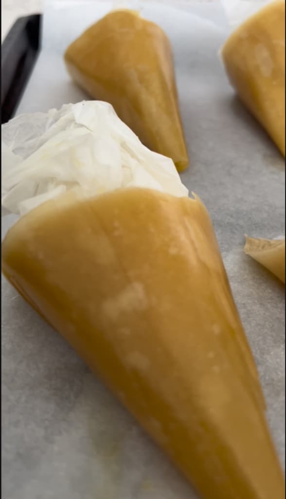 Desserts de pâte filo avec crème pâtissière , semblable aux Trigona Panoramatos. Je dis semblable car cette recette grecque, originaire précisément de Thessalonique, prévoit un sirop de sucre, que j’ai préféré ne pas ajouter. Je dois dire que chaque triangle est super croustillant et délicieux. Pour les rendre très croustillants, j’ai badigeonné chaque feuille avec du beurre fondu. Si vous voulez réaliser la recette grecque originale, vous devez tremper chaque triangle cuit et refroidi dans ce sirop de sucre (1 tasse et ½ de sucre semoule, 3 tasses d’eau, 6 clous de girofle, 1 bâton de cannelle, un peu de zeste de citron ou d’orange. et seulement après les garnir de crème. Les réaliser est vraiment simple. Avec très peu de mouvements, vous obtiendrez des triangles vraiment parfaits. Je les ai servis comme des cornets de glace et je dois dire que mes invités les ont beaucoup appréciés.