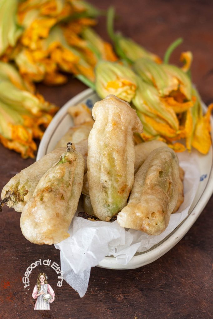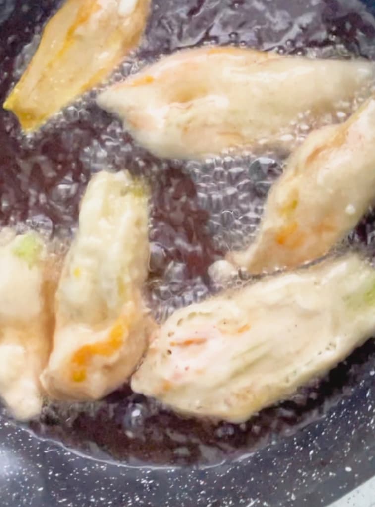 Fleurs de courgettes farcies en pâte à beignet ultra croustillante! Un vrai triomphe de la cuisine italienne, une bouchée qui renferme la délicatesse de la fleur et la gourmandise de la farce, le tout enveloppé dans une croûte qui chante sous les dents.