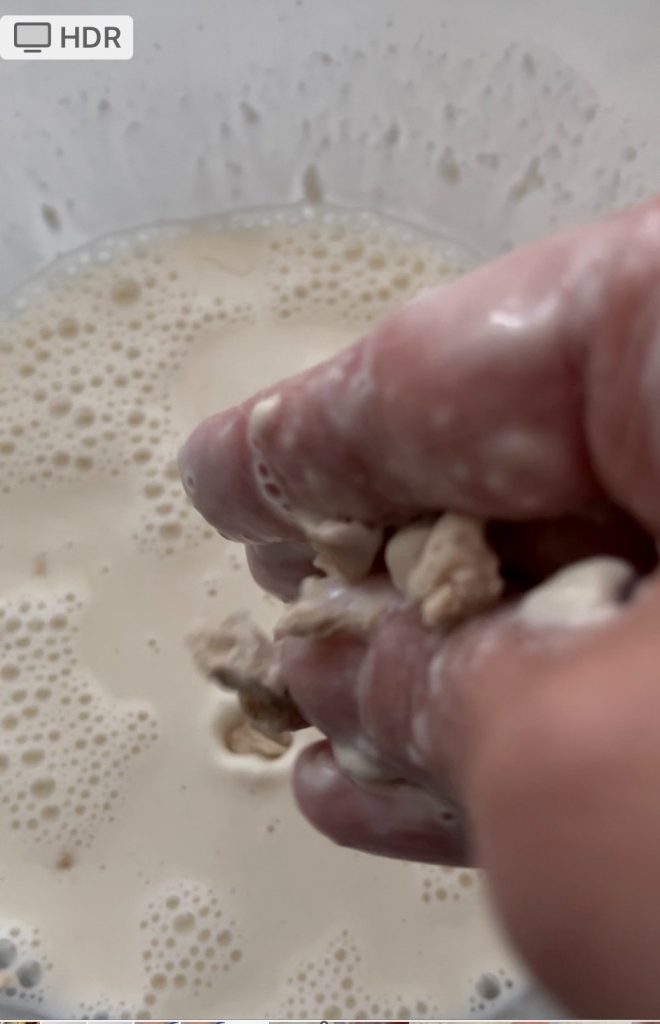 Commencer à ajouter peu à peu l’eau avec le sel dissous dedans.