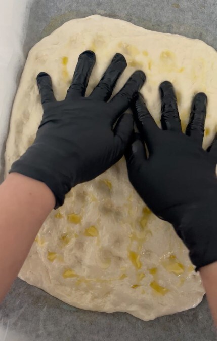 Étaler la pâte avec les doigts en s’humidifiant les mains avec de l’huile d’olive extravierge et laisser lever au four jusqu’à ce qu’il soit temps de cuire au four.