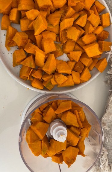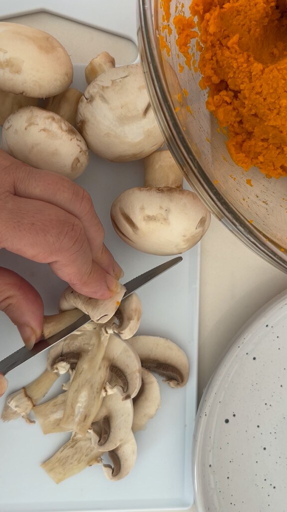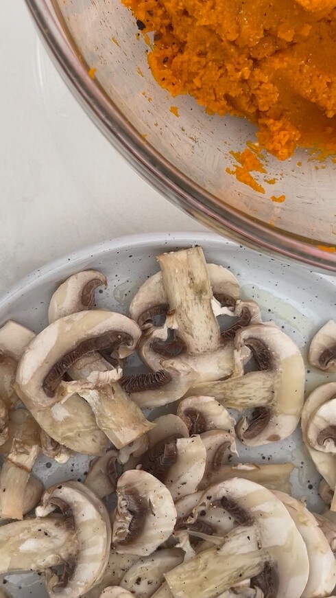 Ajouter le sel, le poivre et un filet d’huile aux champignons et à la purée de potiron