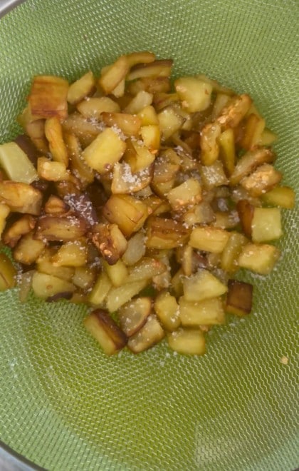 La première chose à faire est de laver et enlever la peau noire des aubergines. Couper les aubergines en petits morceaux