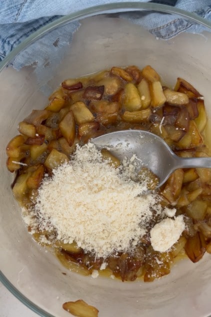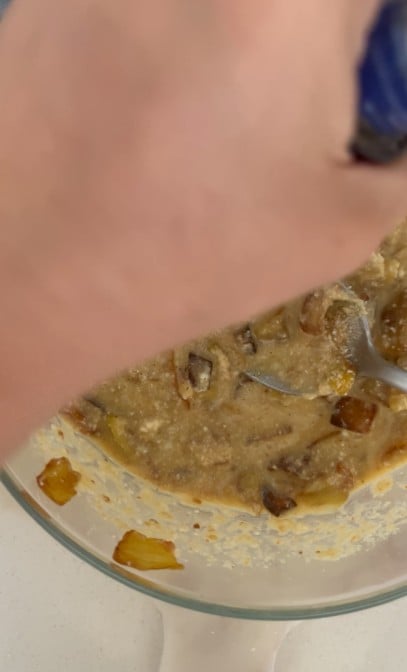 Verser dans un moule pour deux personnes recouvert de papier sulfurisé et avec un filet d’huile d’olive extra vierge. Un filet d’huile d’olive extra vierge également au-dessus, cuire au four préchauffé à 180° pendant 30 min et servir