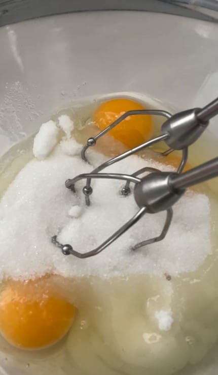 Dans un bol avec le fouet électrique, monter le sucre et les œufs