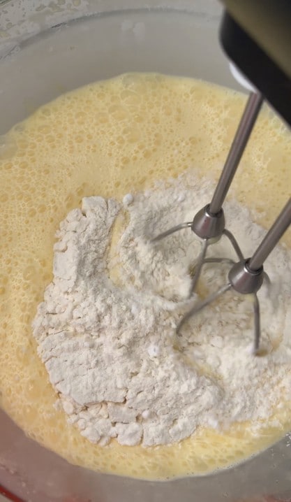 En continuant à travailler, ajouter la farine 00 et la fécule de pommes de terre préalablement tamisées.