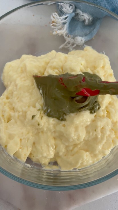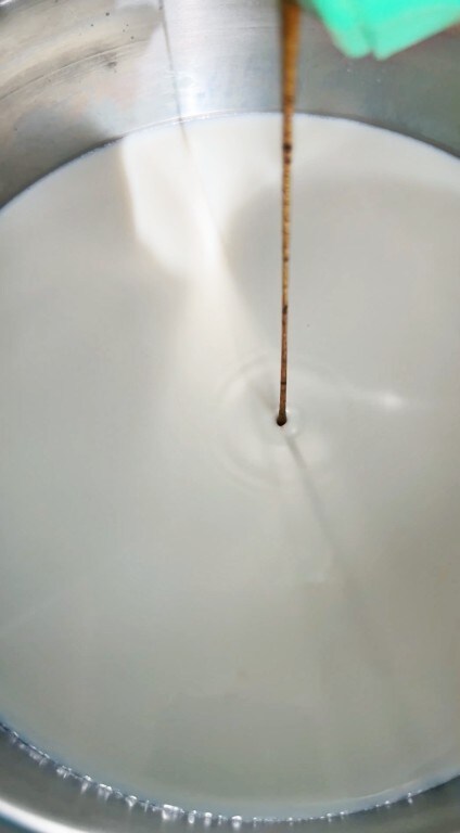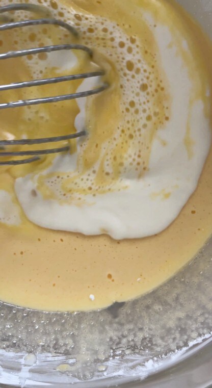 Verser le lait bouillant dans le mélange d’œufs et de farines