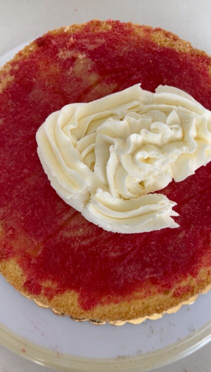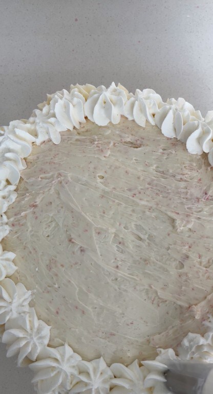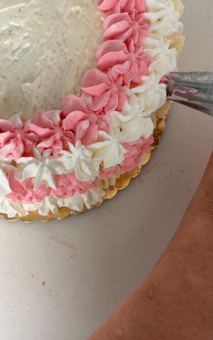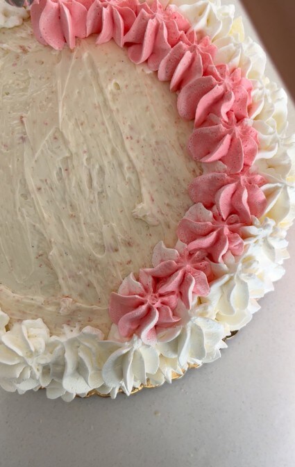 Décorer le gâteau avec la crème rose d’abord sur le dessus