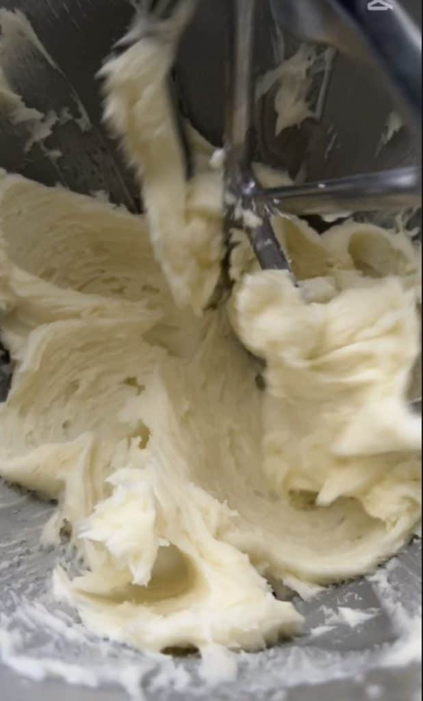 Dans le robot pâtissier, insérez le beurre qui doit être strictement mou comme une pommade. Si vous n’avez pas de robot, mettez tout dans un bol et travaillez avec des fouets électriques.