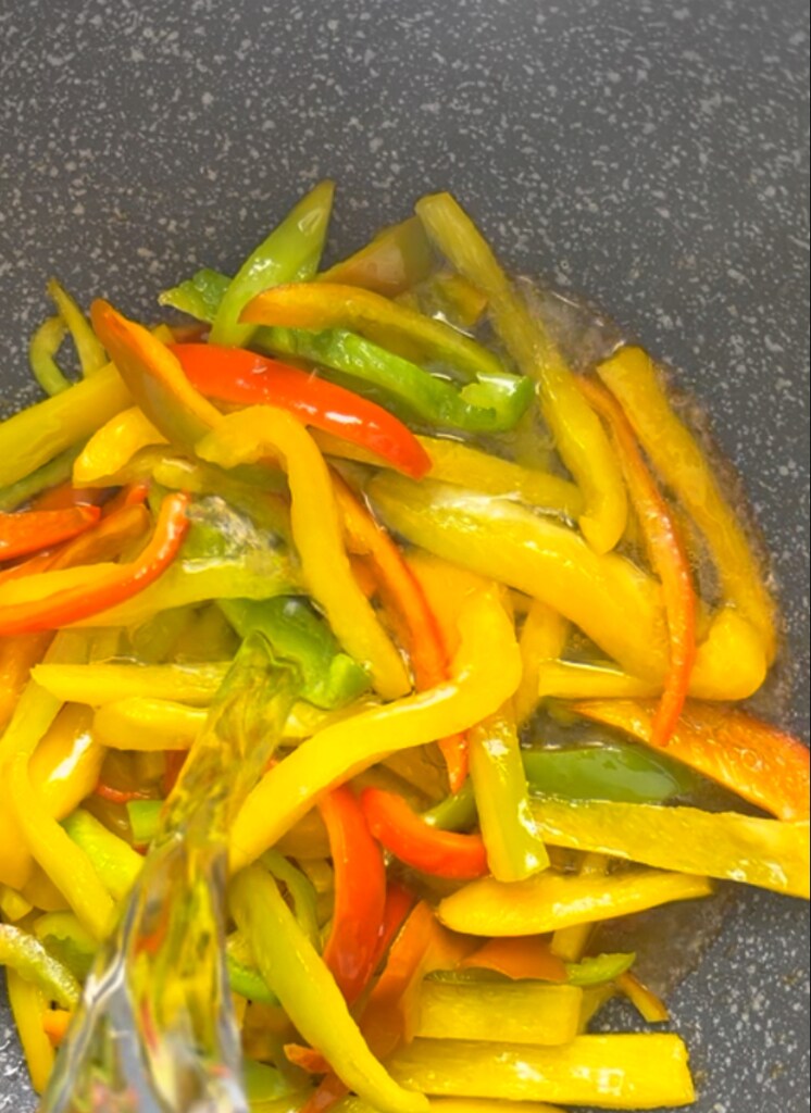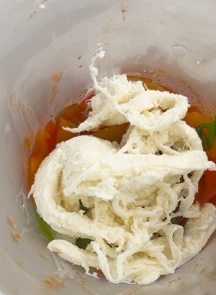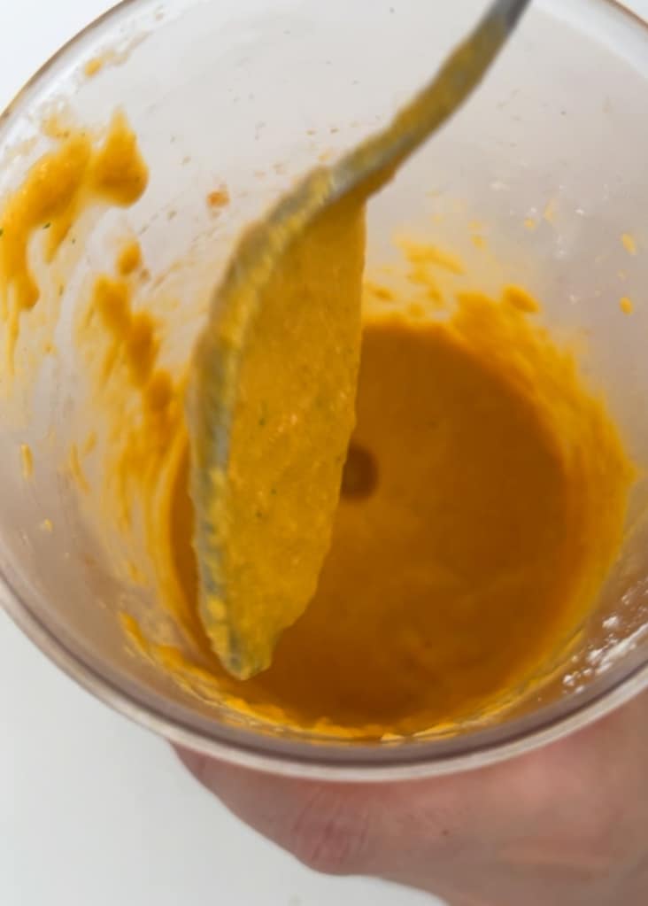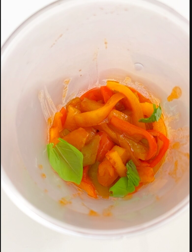 Verser dans un gobelet, en réservant un peu de poivrons.
