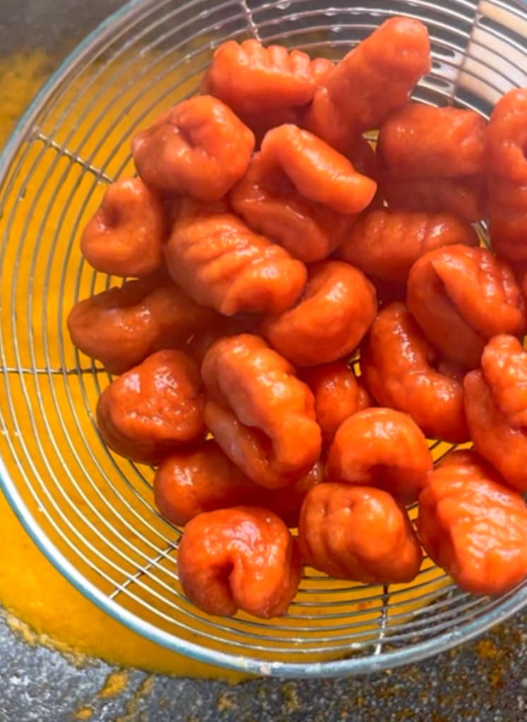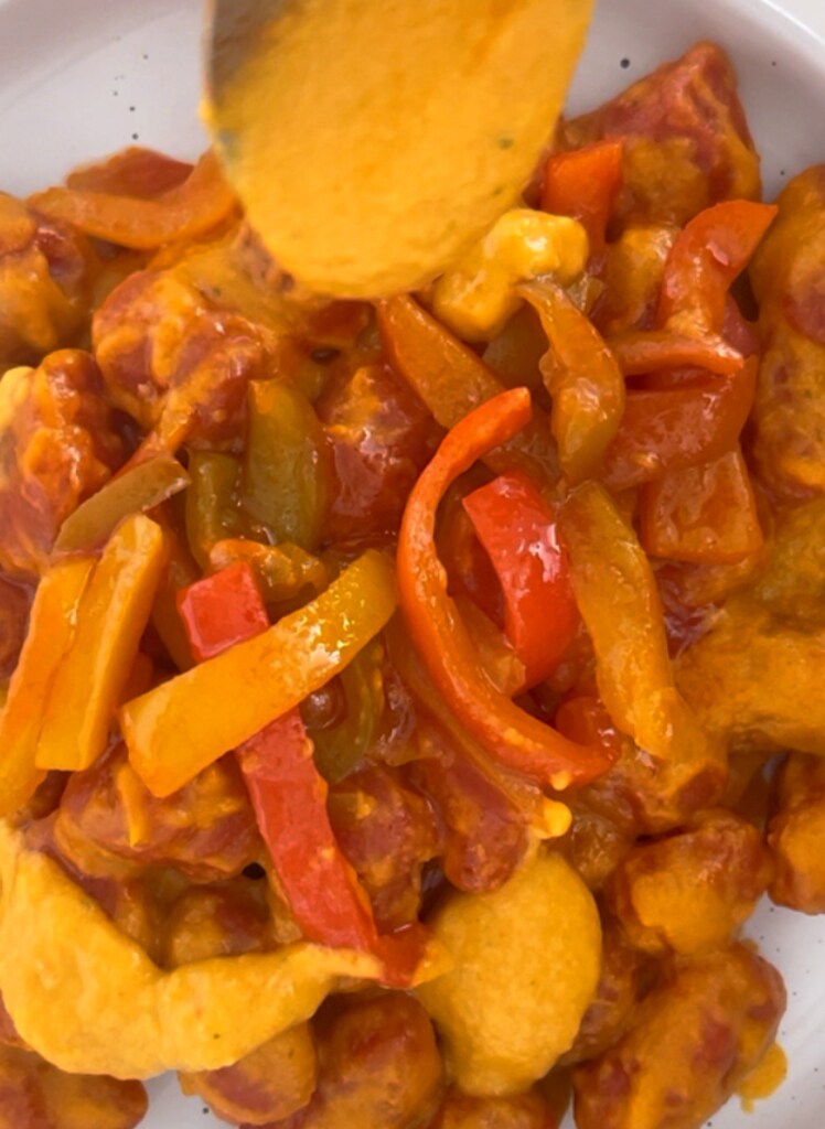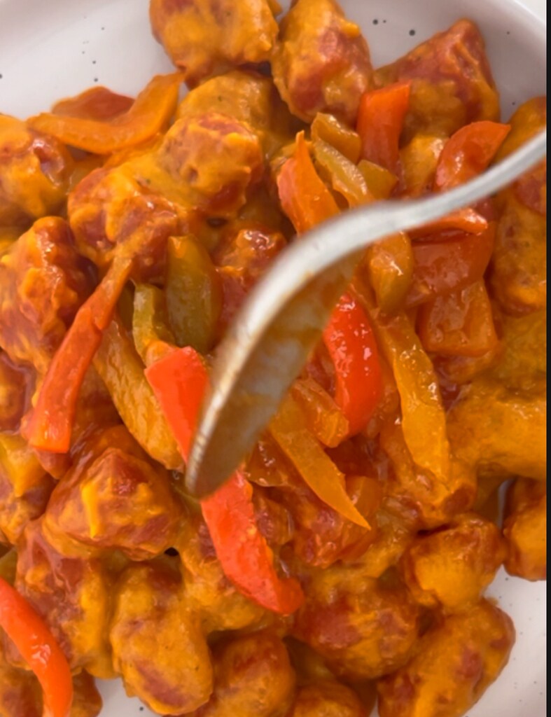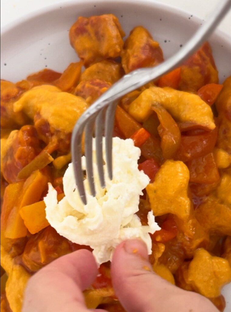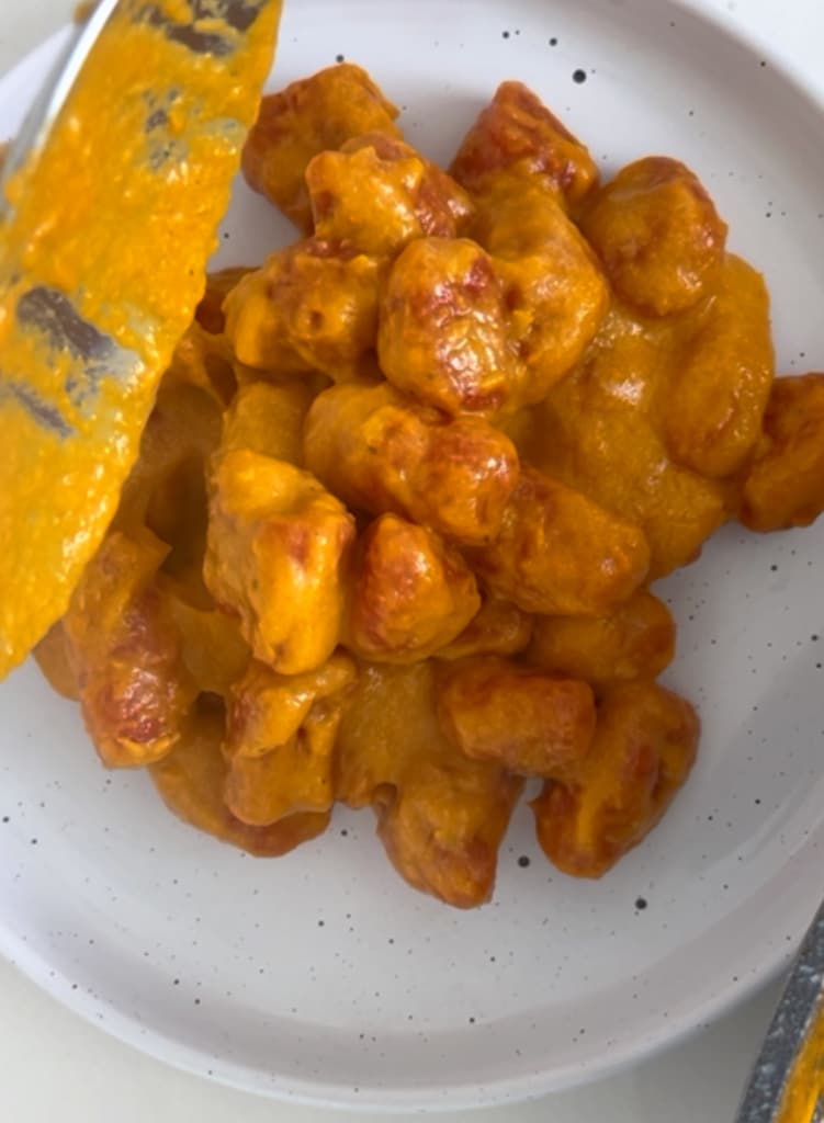 Gnocchis rouges aux poivrons et stracciatella. Imaginez enrouler votre fourchette dans un gnocchi rouge moelleux, juste blanchi. Avec une seule bouchée, vous vous retrouverez immergé dans un nuage de crème de poivrons, douce et enveloppante. La stracciatella, avec sa délicate onctuosité, complète le tout, vous offrant une expérience culinaire inoubliable. Les gnocchis rouges sont faits de tomate, trouvez la recette ici. Une explosion de couleurs et de saveurs dans un seul plat ! Une façon plus rapide de réaliser des gnocchis sans pommes de terre et un goût unique qui vous laissera vraiment sans voix.
