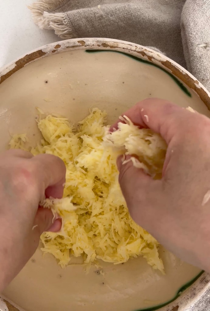 Bien essorer la pomme de terre dans un torchon pour faire sortir son liquide.