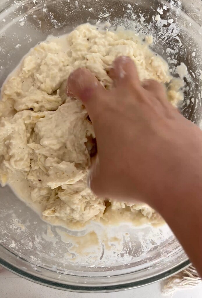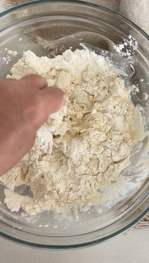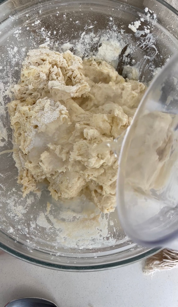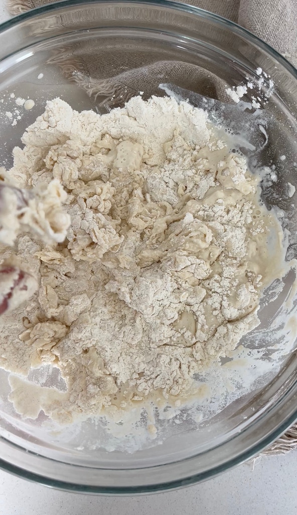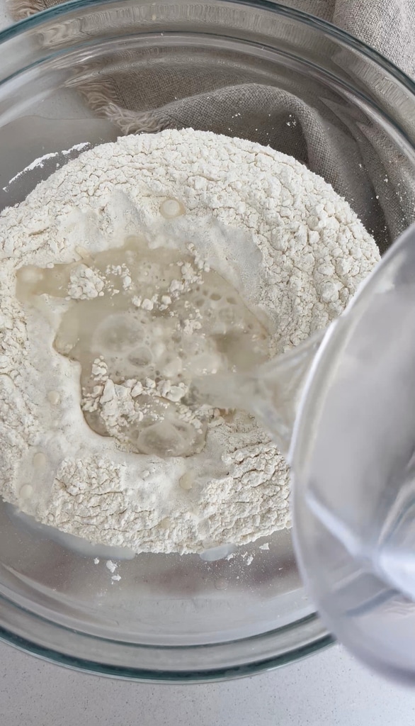Dans un autre bol, verser la farine et ajouter 150 g d’eau du total des ingrédients