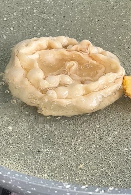 • Lorsque la cartellata est bien dorée, l’égoutter et la placer sur du papier absorbant avec la partie décorée vers le bas, de manière à ce que l’huile présente dans les trous s’évacue et que la cartellata soit sèche