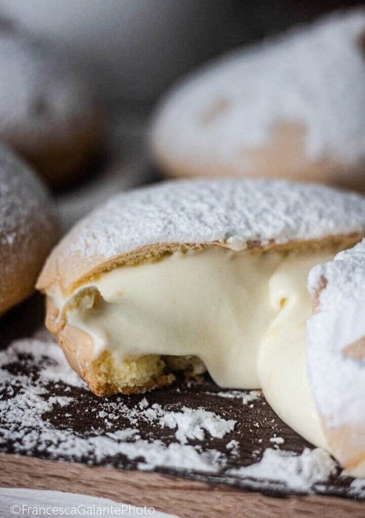 Aujourd’hui, je suis heureuse de partager avec vous cette recette très très recherchée sur le web et absolument mon dessert préféré, LES TETTES DES RELIGIEUSES D’ALTAMURA. Je pars, tout d’abord, du principe que c’était ma 5ème tentative, eh oui mes amies, cela peut sembler simple mais ce n’est pas du tout le cas. J’ai essayé de nombreuses recettes différentes, même celle originale des sœurs, mais rien : dans le four elles gonflent bien et dès qu’elles en sortent, elles se dégonflent. Il y a ceux qui utilisent la farine au lieu du mix africain et déjà ici je vous dis que cela ne va pas du tout, je vous conseille le mix africain et non celui que vous trouvez au supermarché mais celui vendu en vrac dans les magasins pour fournitures de pâtisseries. J’ai essayé la version sans batteur mais je vous assure que cela ne change absolument rien. Cependant, enfin cette 5ème version m’a satisfait, très très similaire à celles que l’on achète en pâtisserie. À propos, si vous vous trouvez du côté d’Altamura, je vous conseille de les acheter à la célèbre pâtisserie, désormais connue pour les tettes des religieuses, la pâtisserie Monastère de Sainte Claire. Ce que je vous conseille pour que cette gourmandise infinie réussisse au mieux, c’est de travailler le mélange pendant au moins 15 minutes au batteur sans jamais l’arrêter et de l’insérer rapidement dans la poche à douille; autre conseil important, préparer la plaque recouverte de papier sulfurisé ou si vous préférez des caissettes, afin de donner forme à nos tettes et de les insérer rapidement dans le four strictement statique à 170°. Autre conseil est de mettre une cuillère entre le four et la porte pour laisser sortir l’humidité, et une fois la cuisson terminée laisser les tettes dans le four pour qu’elles sèchent, si à la fin de la cuisson elles sont humides et que vous les sortez, je vous assure qu’elles se dégonfleront instantanément. Si vous suivez ces règles, je vous assure qu’elles seront vraiment super