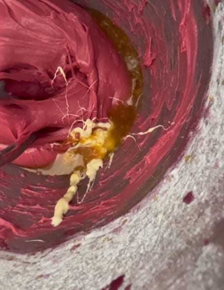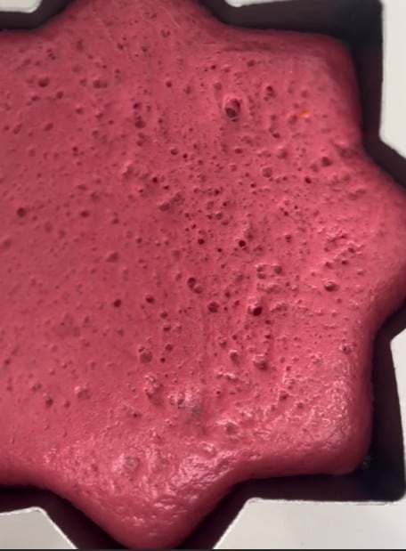 Eh bien mes amies, aujourd’hui je vous présente mon Pandoro au levain naturel à la betterave. Tout est parti de l’idée de réaliser mon pandoro red velvet avec levain naturel mais sans colorant. Je voulais le faire le plus artisanal et naturel possible. Je voulais donc remplacer le colorant rouge du red velvet par l’extrait en poudre naturelle de betterave. La couleur du pandoro cru était parfaite mais comme tous les colorants naturels, à la cuisson, ils perdent beaucoup de leur couleur et voici le résultat, à savoir un pandoro au goût merveilleux et parfait dans sa structure mais légèrement coloré. Cela ne veut pas dire que je ne vous conseille pas de le réaliser tranquillement même si vous le souhaitez sans poudre de betterave, naturellement vous obtiendrez un pandoro artisanal parfait comme en pâtisserie mais pas rouge comme mon désormais très apprécié pandoro red velvet à la couleur intense et inimitable.