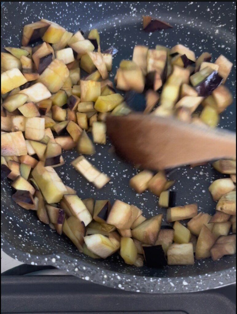 Laver d’abord les aubergines. Découper une aubergine en cubes très petits et les cuire à la poêle avec ail, huile d’olive et sel.