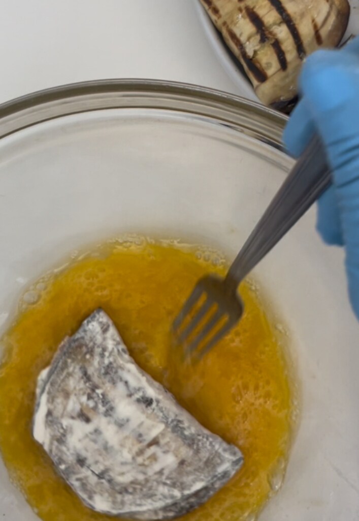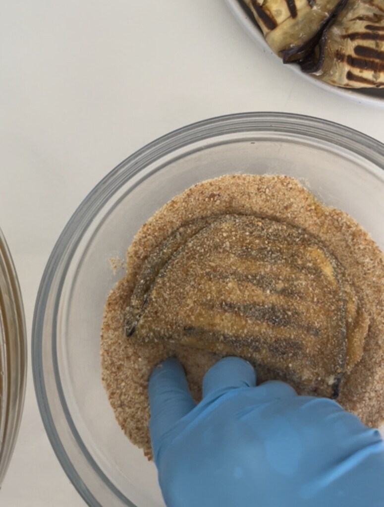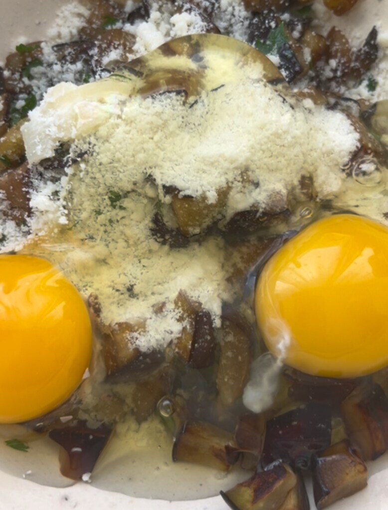 Dans un bol, ajouter les aubergines cuites en cubes, le sel, l’ail haché, le persil haché, le grana et les œufs. Bien mélanger et amalgamer le tout.