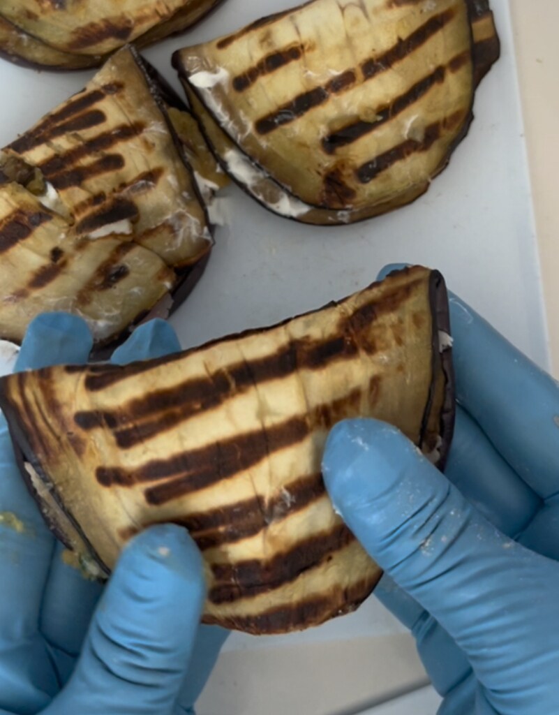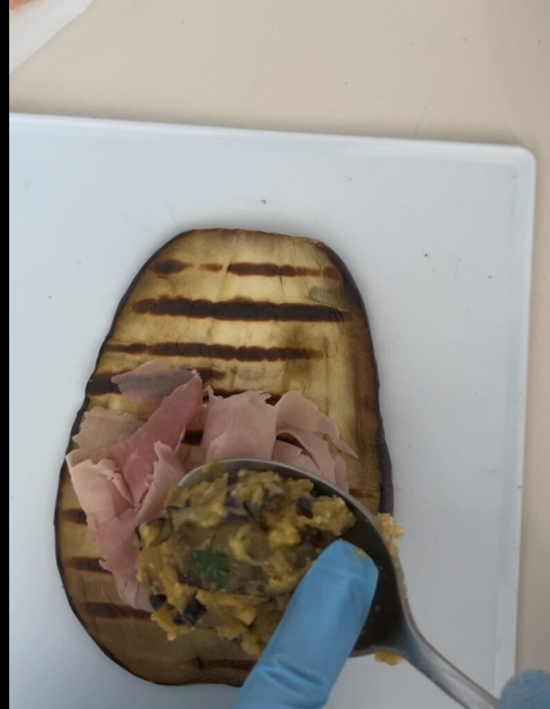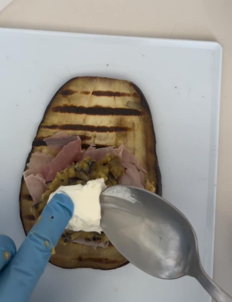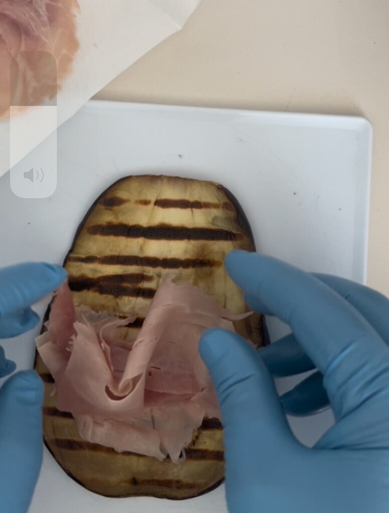 À ce stade, garnir la tranche d’aubergine grillée avec du jambon.