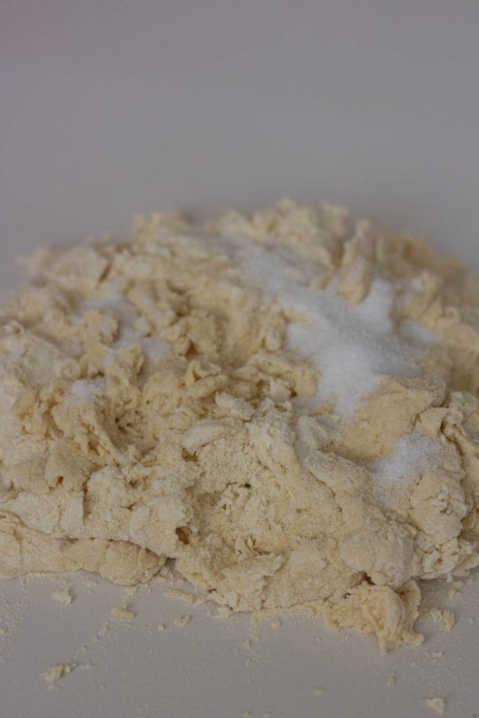 Quand les liquides ont absorbé les farines, verser sur le plan de travail et ajouter le sel fin.