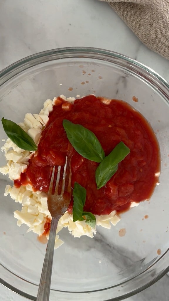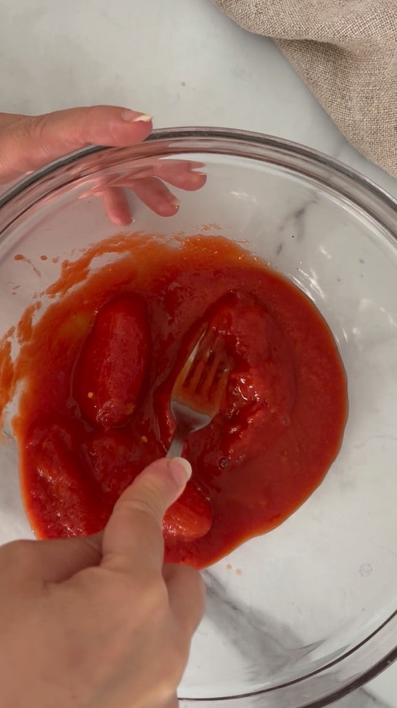 Dans un autre bol, verser la tomate pelée et écraser avec une fourchette.