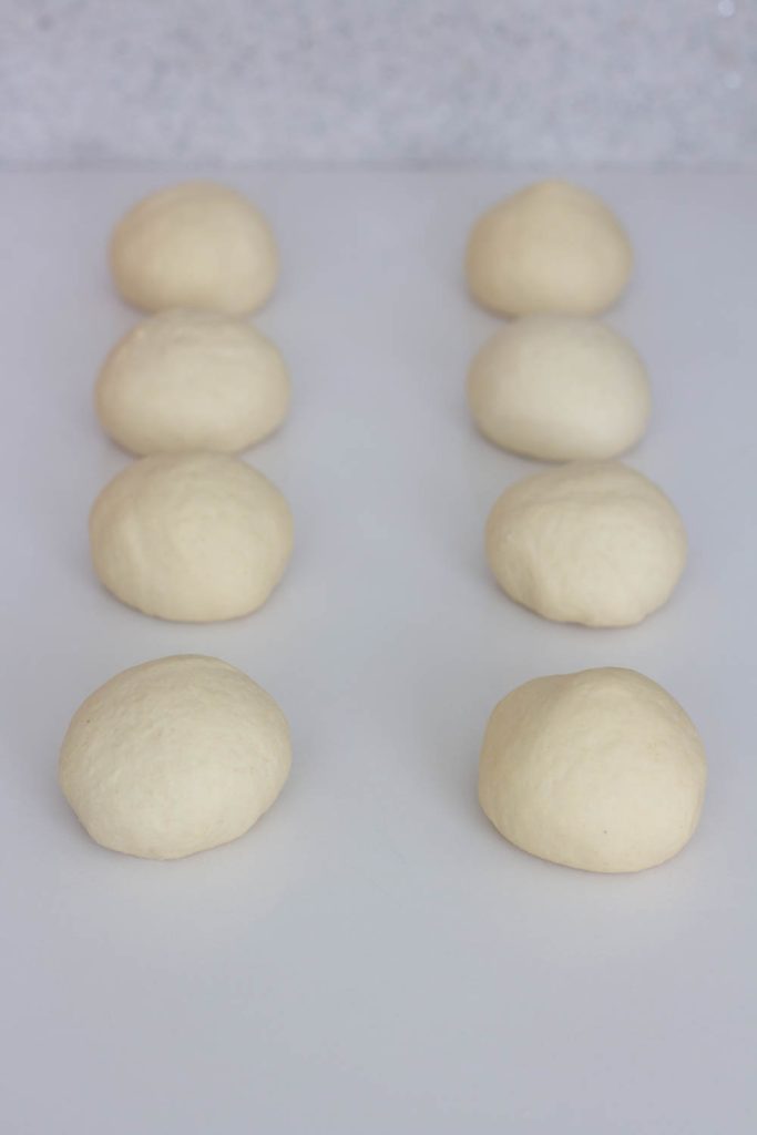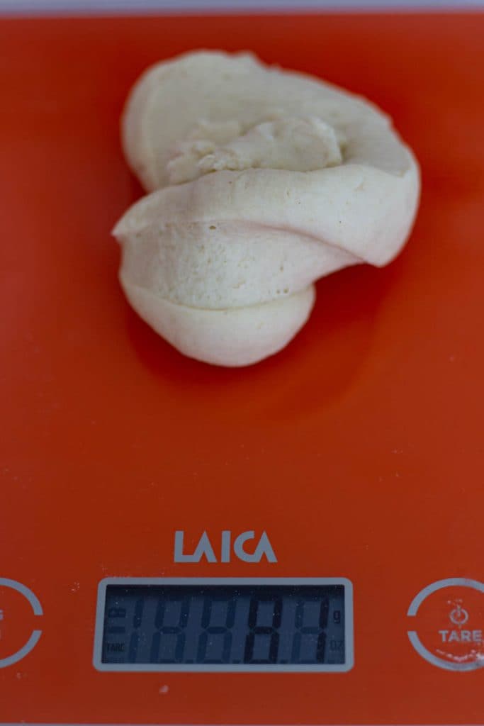 Prélever des morceaux de pâte de 80 g chacun. J’ai obtenu 10 morceaux.