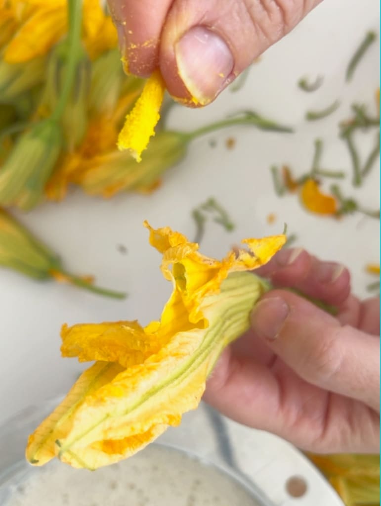 Laver les fleurs de courgette, les sécher avec un torchon et délicatement retirer le pistil à l’intérieur.
